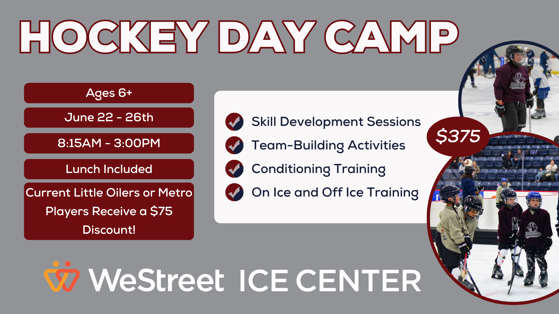 Our Summer Hockey Camp is a full-week program designed to help players improve their skating, skills, and conditioning while having fun both on and off the ice. The camp runs June 22 through June 26 from 8:15 AM to 3:00 PM and includes two ice sessions each day, off-ice activities, and snack time, all supervised by our experienced coaching staff. The cost is $375. Please note that if the session is full, you can still sign up to be placed on a waitlist for the next session.