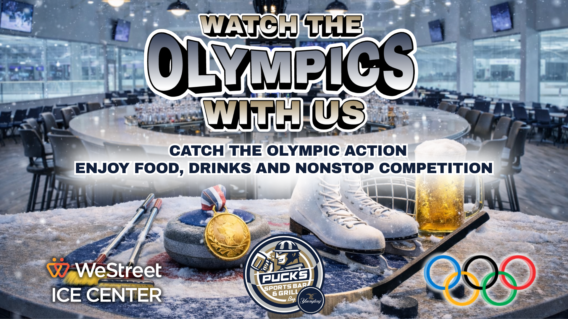 Watch the Olympics all throughout the event at Puckâs Sports Bar & Grill! Weâll be showing the biggest events on our TVs so you can catch thrilling moments while enjoying great food, cold drinks, and a fun atmosphere. Grab your crew, pick your favorite country, and make Puckâs your go-to spot for Olympic viewing all season.