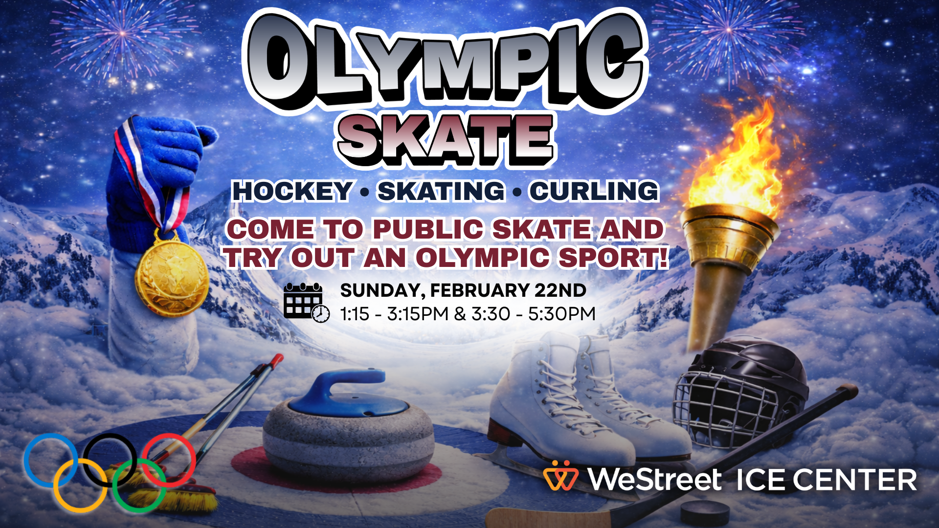 Join us for a special Olympics-themed Public Skate on February 22nd from 1:15pm to 5:30pm packed with fun on and off the ice! Enjoy open skating along with interactive Olympic-style challenges, games, and activities for all ages throughout the afternoon. Whether youâre racing for fun, testing your skills, or just gliding with friends and family, itâs a perfect way to celebrate the spirit of the Olympics at the rink. Come ready to skate, compete, and have a blast!