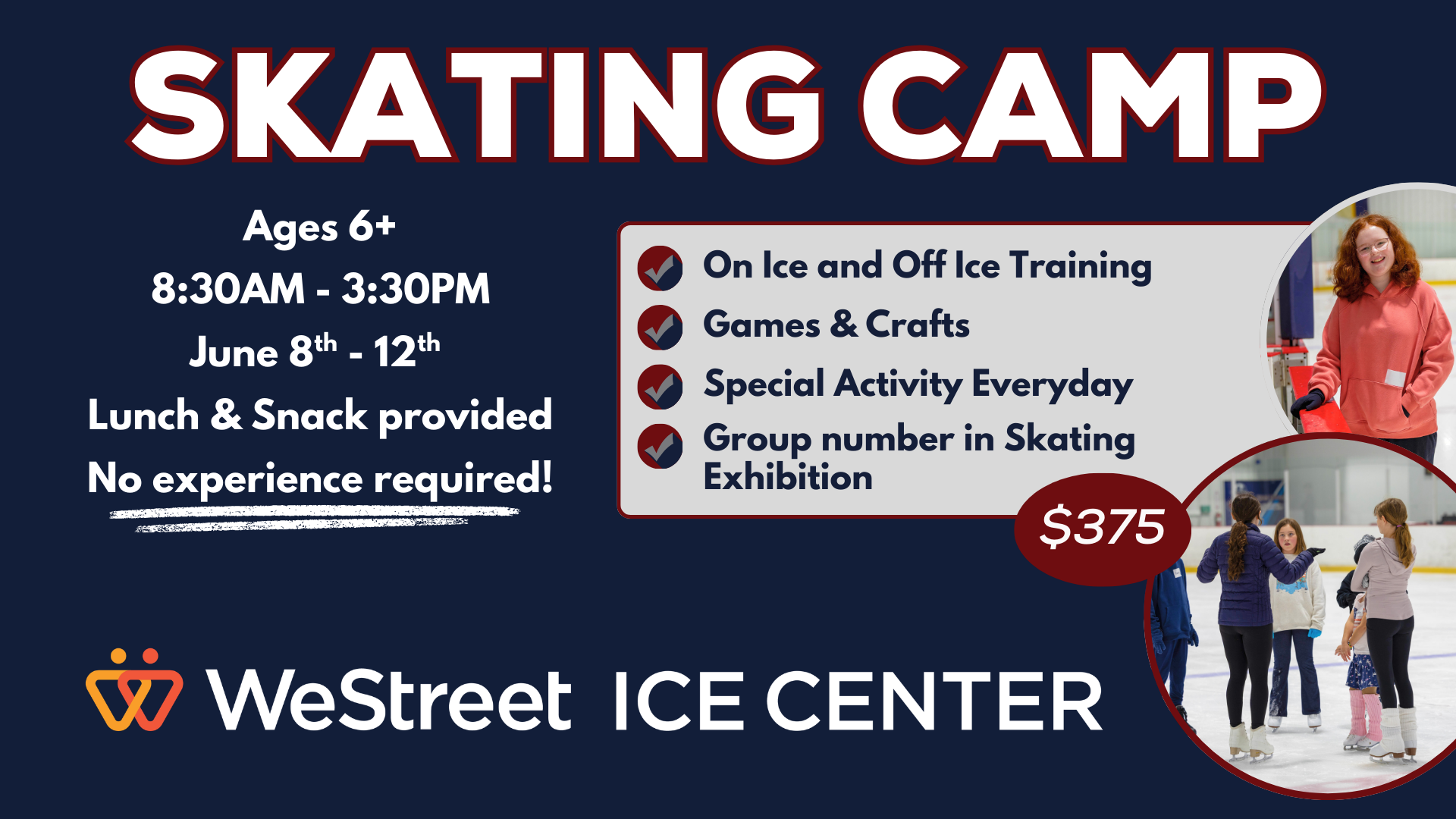 Join us for our Summer Skating Camp from June 8–12, held daily from 8:30 AM to 3:30 PM! This full-day camp is perfect for skaters of all levels and includes on-ice and off-ice training, daily special activities, fun crafts, and preparation of a group number for a skating exhibition at the end of the week. The cost is $375 per skater and includes lunch and snacks each day, making this a fun, active, and stress-free summer experience. Register HERE!